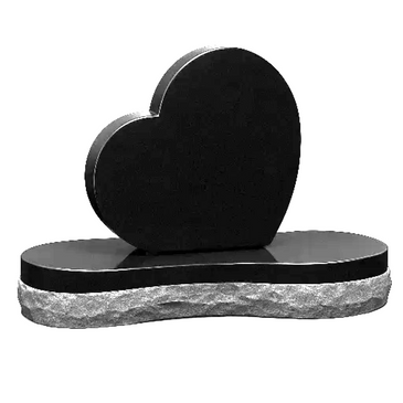 A polished granite base with an upright headstone featuring a heart-shaped design, crafted in contrasting black and white granite.