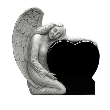 Gracefully sculpted granite monument featuring a serene angel embracing a polished heart-shaped stone. The angel symbolizes guardianship and peace, while the heart represents eternal love and devotion, making this design a deeply meaningful tribute.