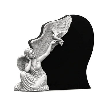 Elegant black granite memorial featuring a finely sculpted angel with detailed wings holding a dove, symbolizing peace and eternal love.